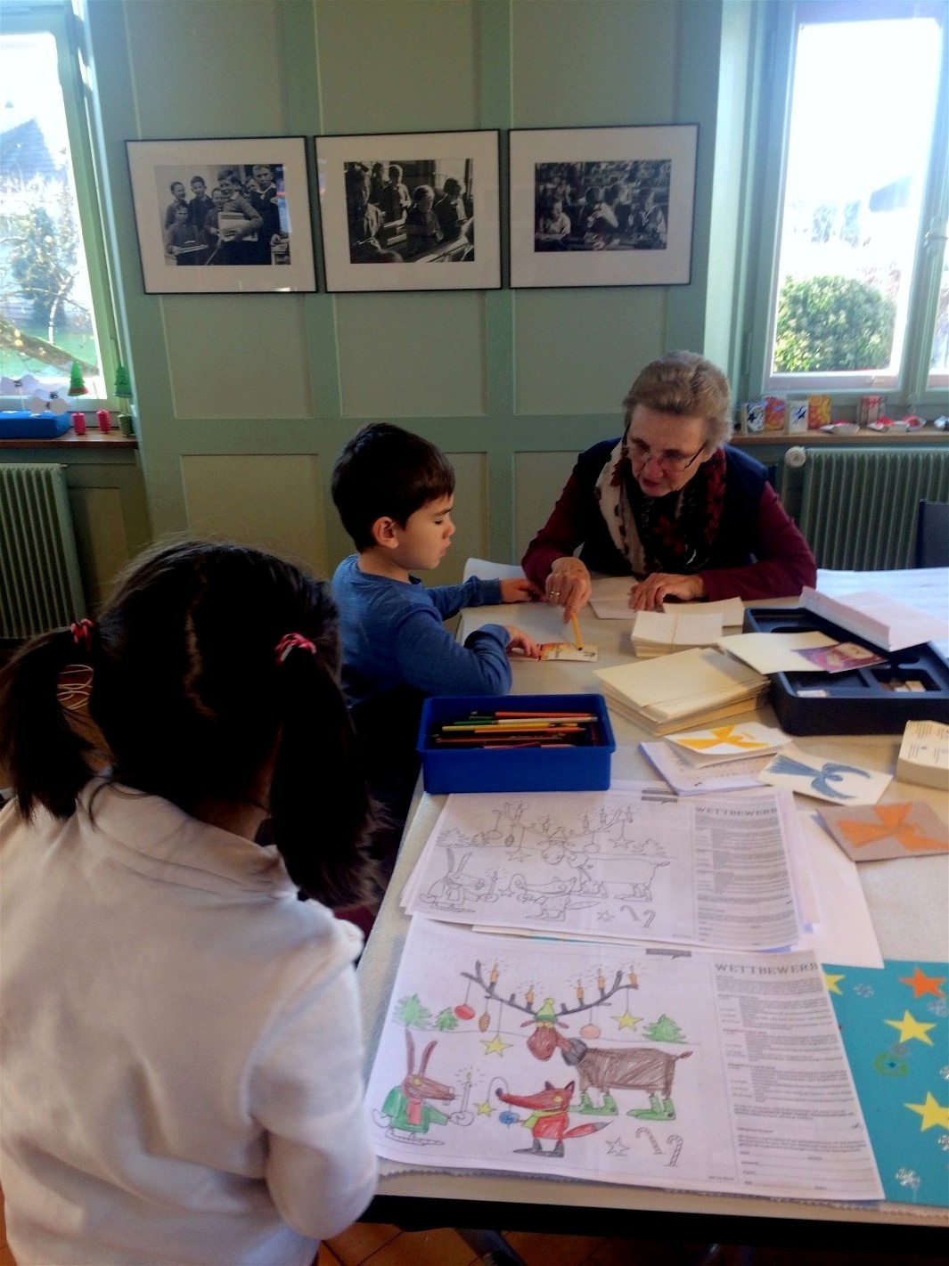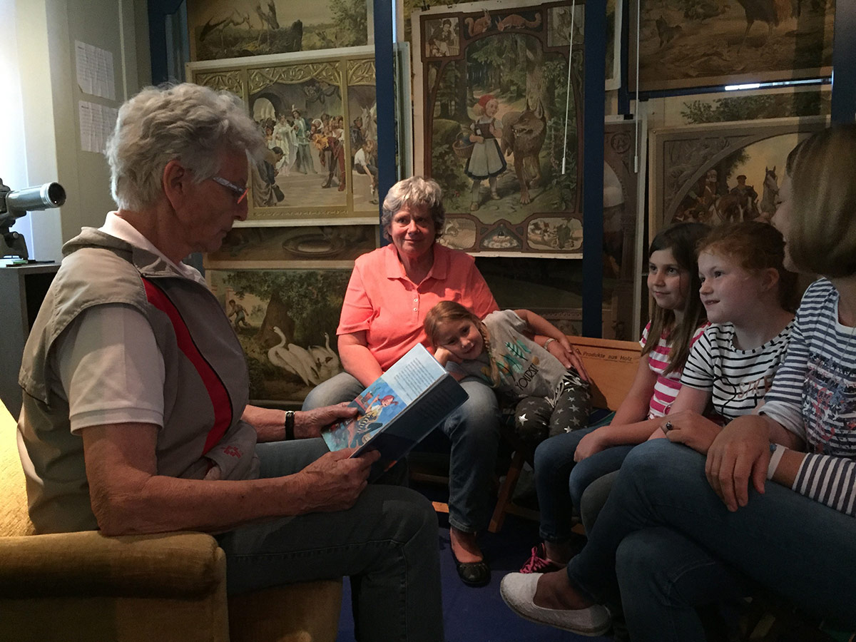Aufmerksam hören Kinder und Erwachsenen den Geschichten im Schulmuseum zu. Das Schulmuseum beteiligte sich am nationalen Vorlesetag vom 23. Mai 2018.