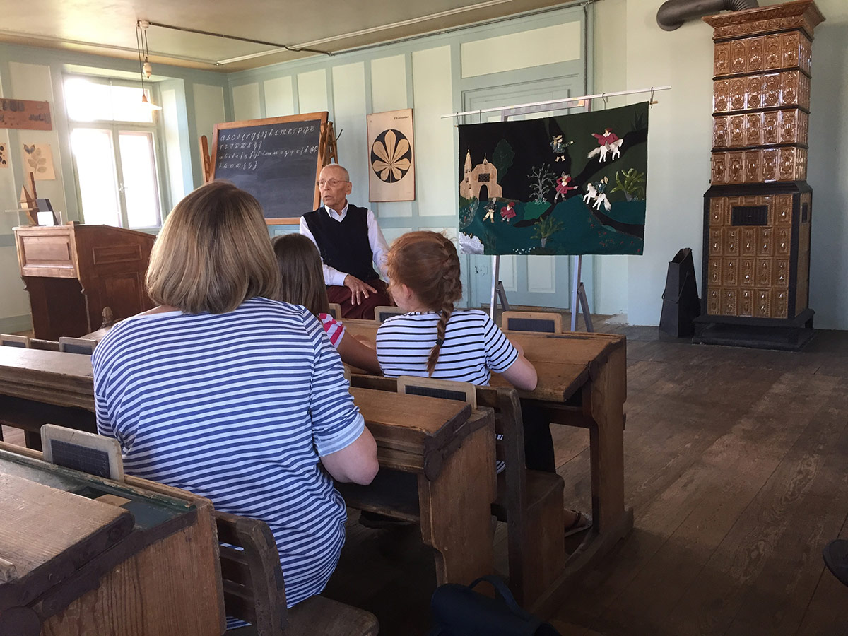 Aufmerksam hören Kinder und Erwachsenen den Geschichten im Schulmuseum zu. Das Schulmuseum beteiligte sich am nationalen Vorlesetag vom 23. Mai 2018.